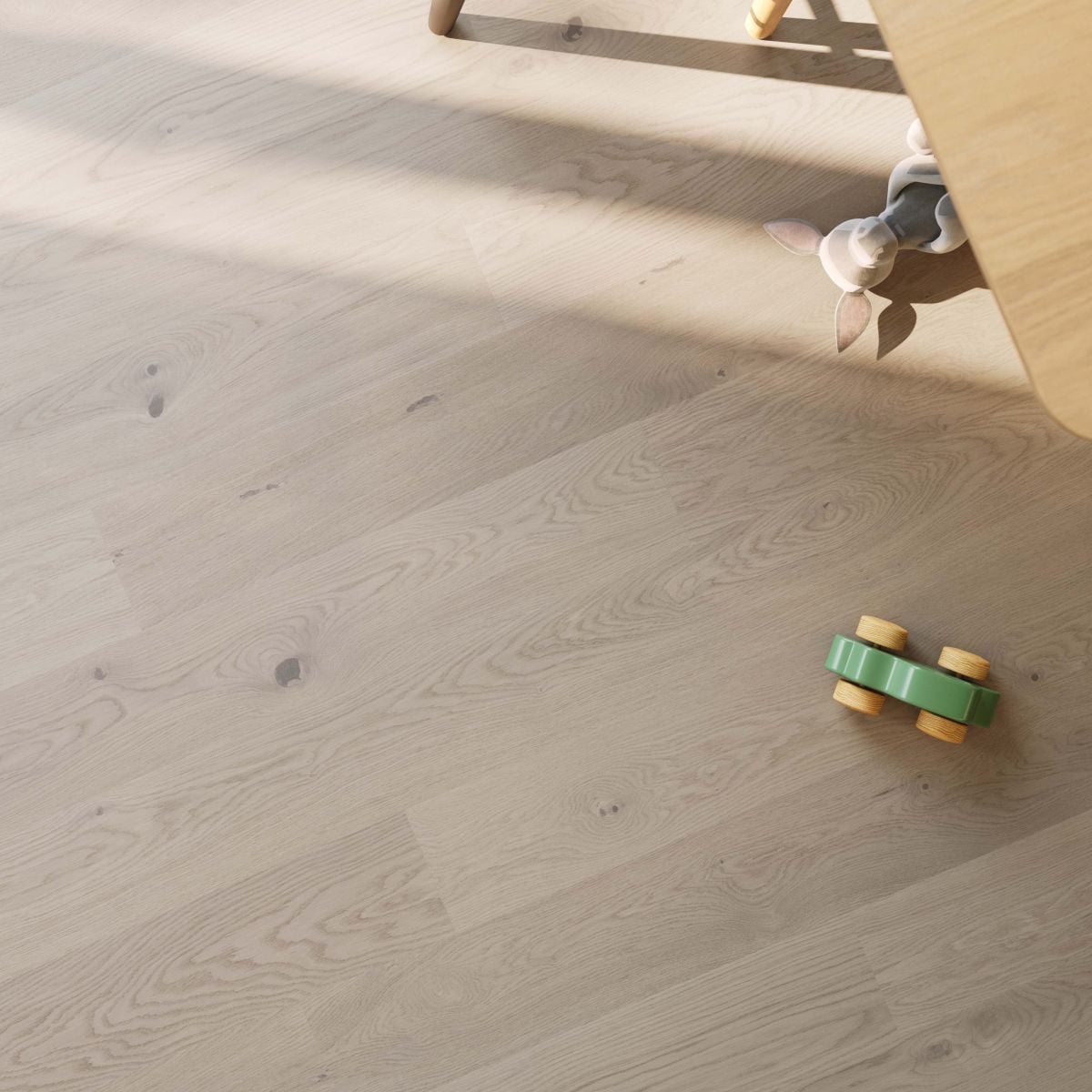 BOHULT 3.0 M är ett modernt mattlackat härdat trägolv i en mjukt grå ton som skapar en behaglig
