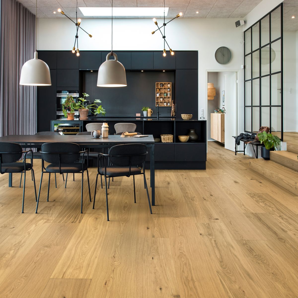 Den mattlackade ytan skyddar effektivt mot vardagligt slitage, minskar reflexer och bevarar samtidigt känslan av äkta trä. Resultatet är ett golv med ett ljust, harmoniskt och tidlöst uttryck som passar i många olika typer av interiörer.