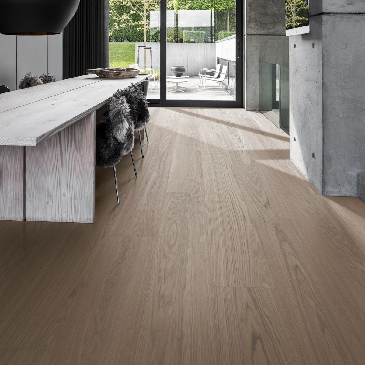 Den mattlackade ytan skyddar effektivt mot vardagligt slitage, minskar reflexer och bevarar samtidigt känslan av äkta trä. Resultatet är ett golv med ett ljust, harmoniskt och tidlöst uttryck som passar i många olika typer av interiörer.