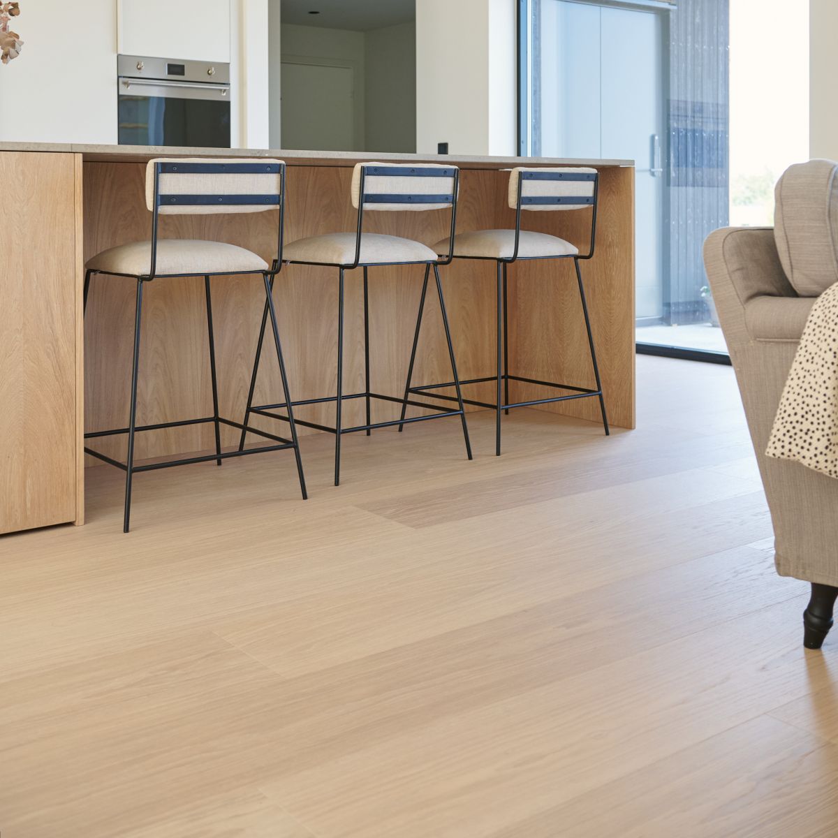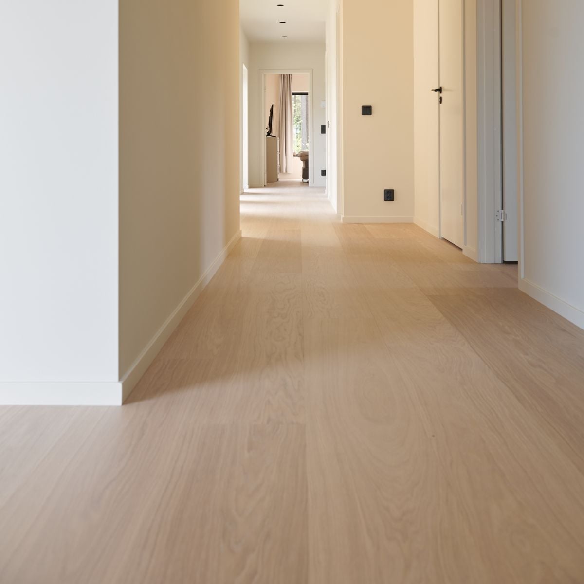 Den mattlackade ytan skyddar effektivt mot vardagligt slitage, minskar reflexer och bevarar samtidigt känslan av äkta trä. Resultatet är ett golv med ett ljust, harmoniskt och tidlöst uttryck som passar i många olika typer av interiörer.