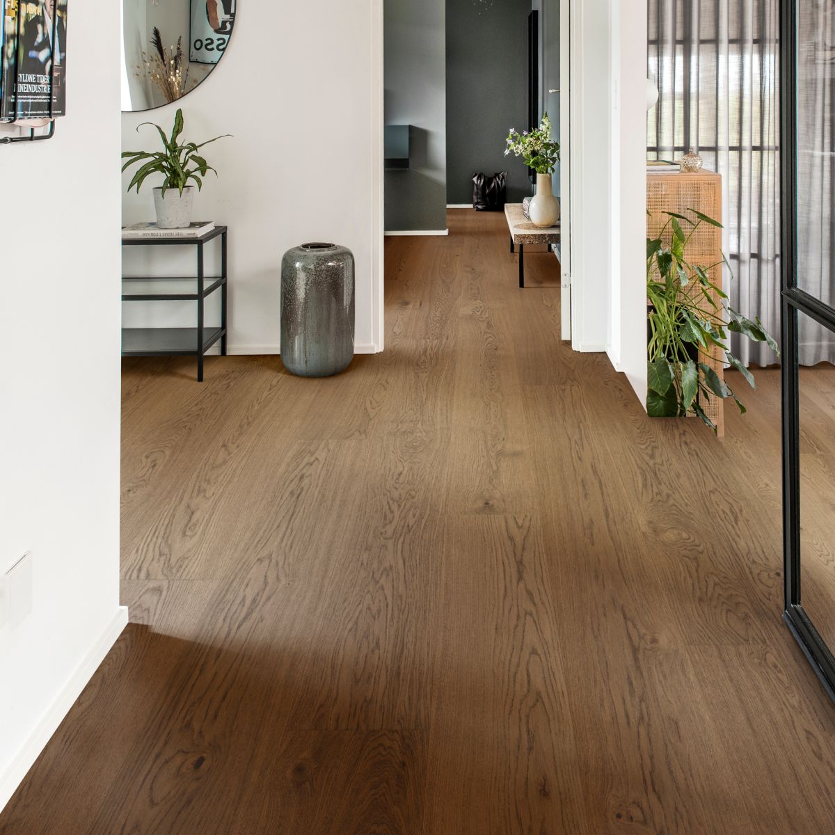 Plankformatet i XXL skapar en lugn och sammanhängande golvyta med färre skarvar, vilket ger rummet ett mer öppet och exklusivt intryck. Kombinationen av härdad yta och golvets stabila konstruktion gör det väl lämpat för både privata hem och miljöer med hög belastning.
