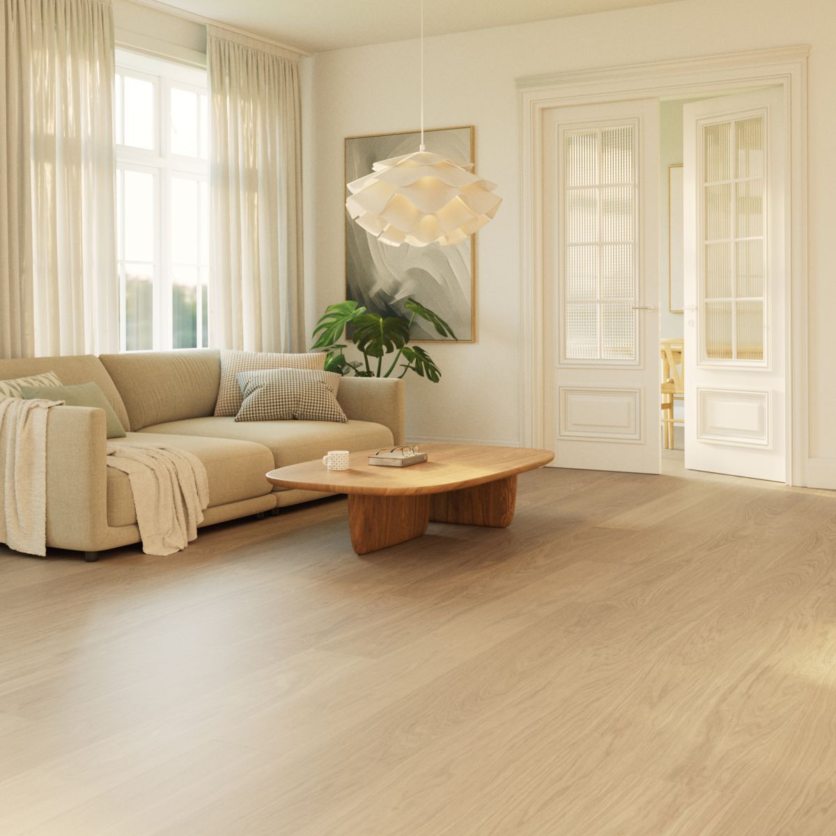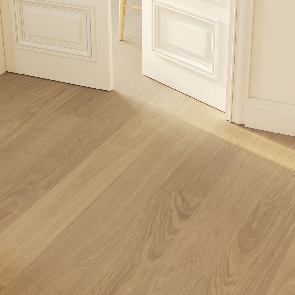 Den mattlackade ytan skyddar effektivt mot vardagligt slitage, minskar reflexer och bevarar samtidigt känslan av äkta trä. Resultatet är ett golv med ett ljust, harmoniskt och tidlöst uttryck som passar i många olika typer av interiörer.