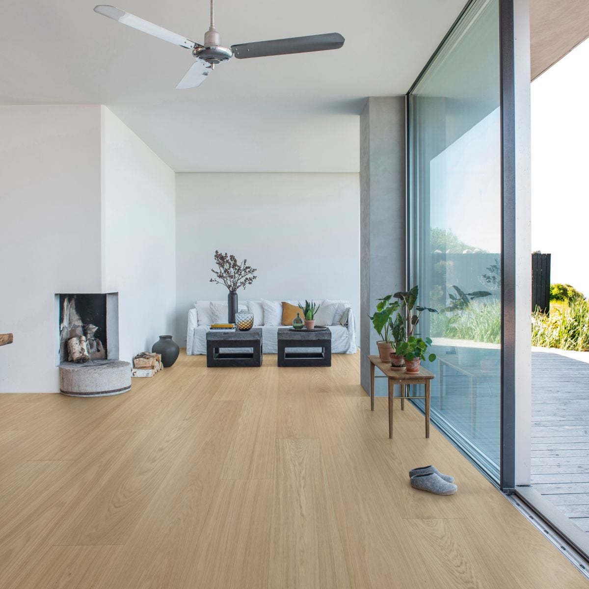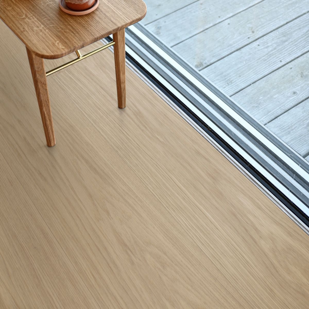 Den mattlackade ytan skyddar effektivt mot vardagligt slitage, minskar reflexer och bevarar samtidigt känslan av äkta trä. Resultatet är ett golv med ett ljust, harmoniskt och tidlöst uttryck som passar i många olika typer av interiörer.