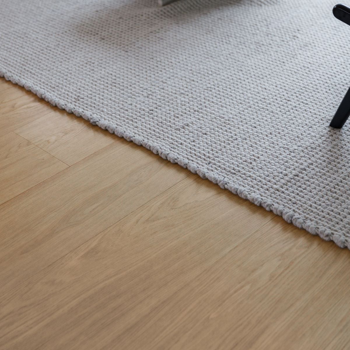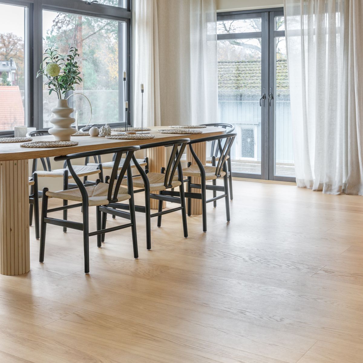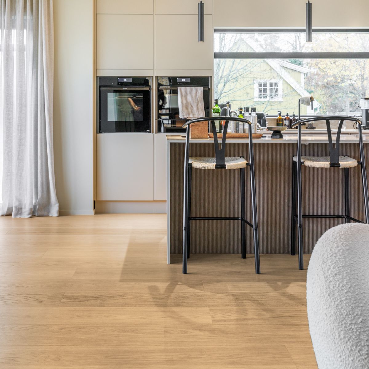 Den mattlackade ytan skyddar effektivt mot vardagligt slitage, minskar reflexer och bevarar samtidigt känslan av äkta trä. Resultatet är ett golv med ett ljust, harmoniskt och tidlöst uttryck som passar i många olika typer av interiörer.