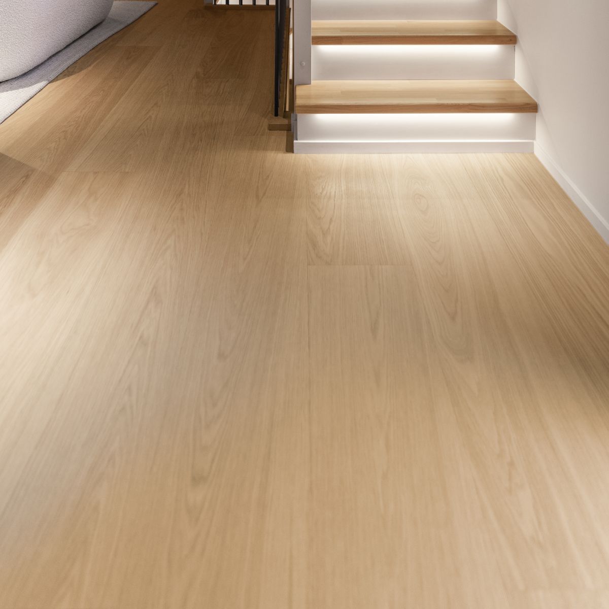 Plankformatet i XXL skapar en lugn och sammanhängande golvyta med färre skarvar, vilket ger rummet ett mer öppet och exklusivt intryck. Kombinationen av härdad yta och golvets stabila konstruktion gör det väl lämpat för både privata hem och miljöer med hög belastning.