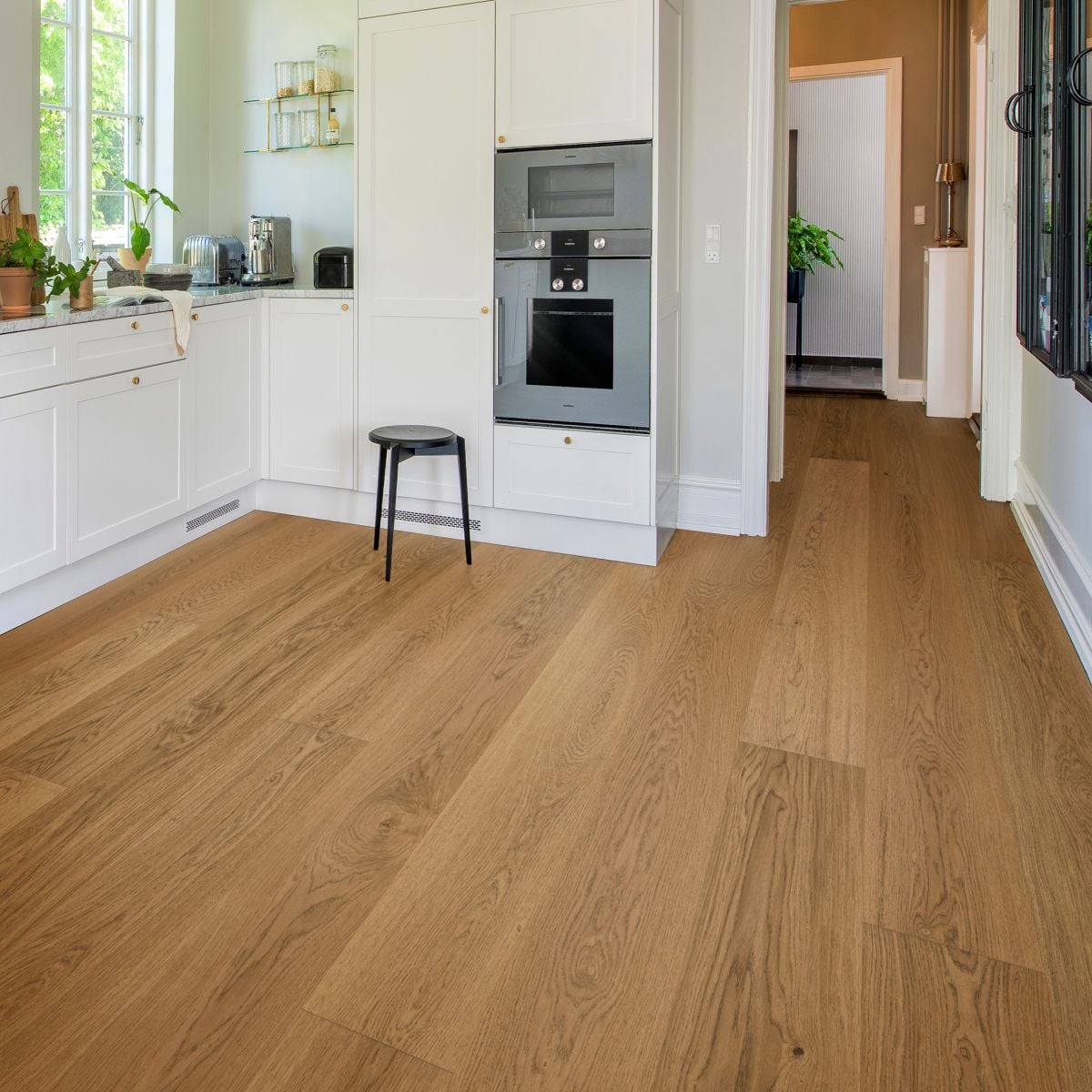 Den mattlackade ytan skyddar effektivt mot vardagligt slitage, minskar reflexer och bevarar samtidigt känslan av äkta trä. Resultatet är ett golv med ett ljust, harmoniskt och tidlöst uttryck som passar i många olika typer av interiörer.