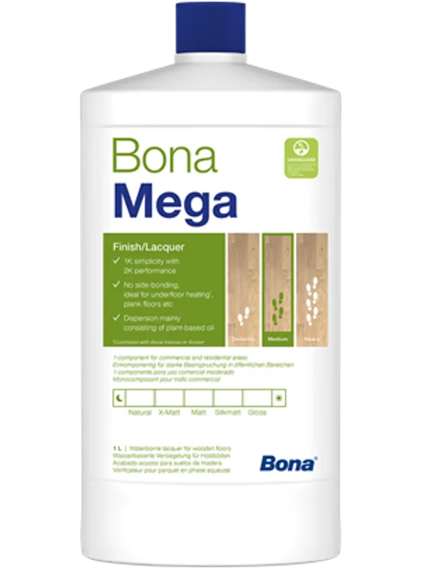 Bona Mega Matt är en vattenburen enkomponentslack som härdar med syret i luften, vilket ger