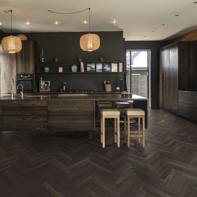 Kährs fiskbensparkett Master Studio i rökt ek med oljad yta är ett exklusivt och tidlöst parkettgolv som kombinerar klassiskt fiskbensmönster med en djup brun ton och naturlig träkänsla. Den rökta behandlingen ger golvet ett varmt, elegant uttryck som skapar karaktär och djup i både moderna och klassiska interiörer.