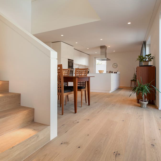 Den vitpigmenterade, borstade ytan ljusar upp rummet och lyfter fram ekens