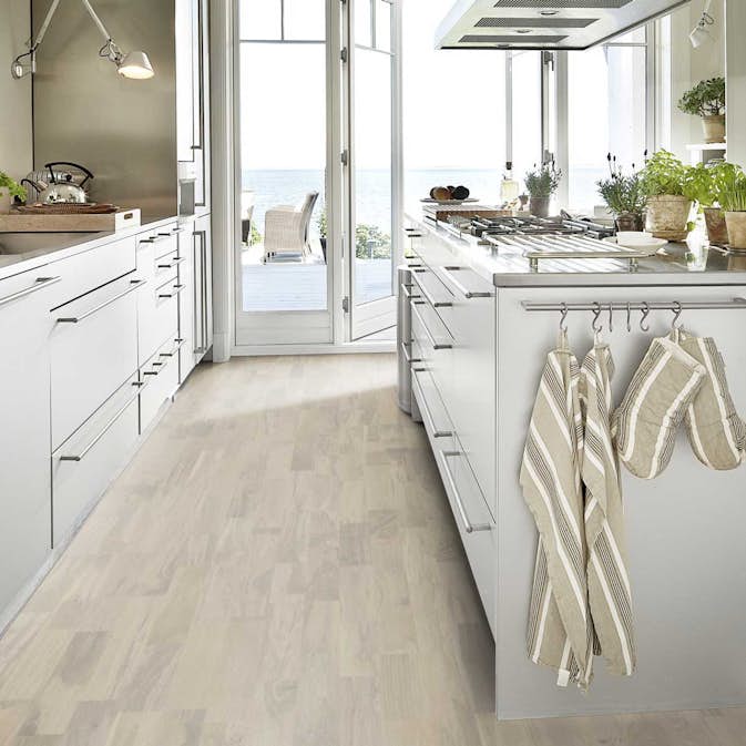 Kährs Ek Vapor är ett borstat 2-stavsgolv i ek med en semitransparent vit nyans som balanserar