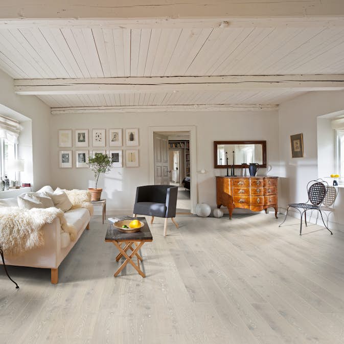 Kährs Bright Ek är ett 1-stavsgolv med pudervit yta som lyfter fram plankgolvets naturliga
